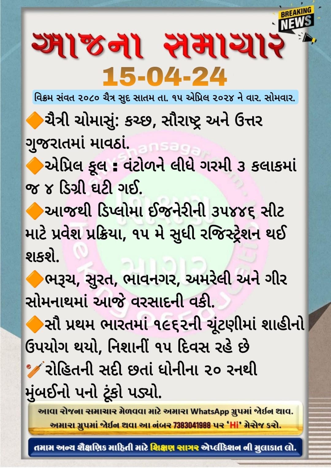 આજના મહત્વના શેક્ષણીક સમાચાર 15/04/2024 Admin April 15, 2024 Uncategorized Comments આજના મહત્વના શેક્ષણીક સમાચાર 15/04/2024