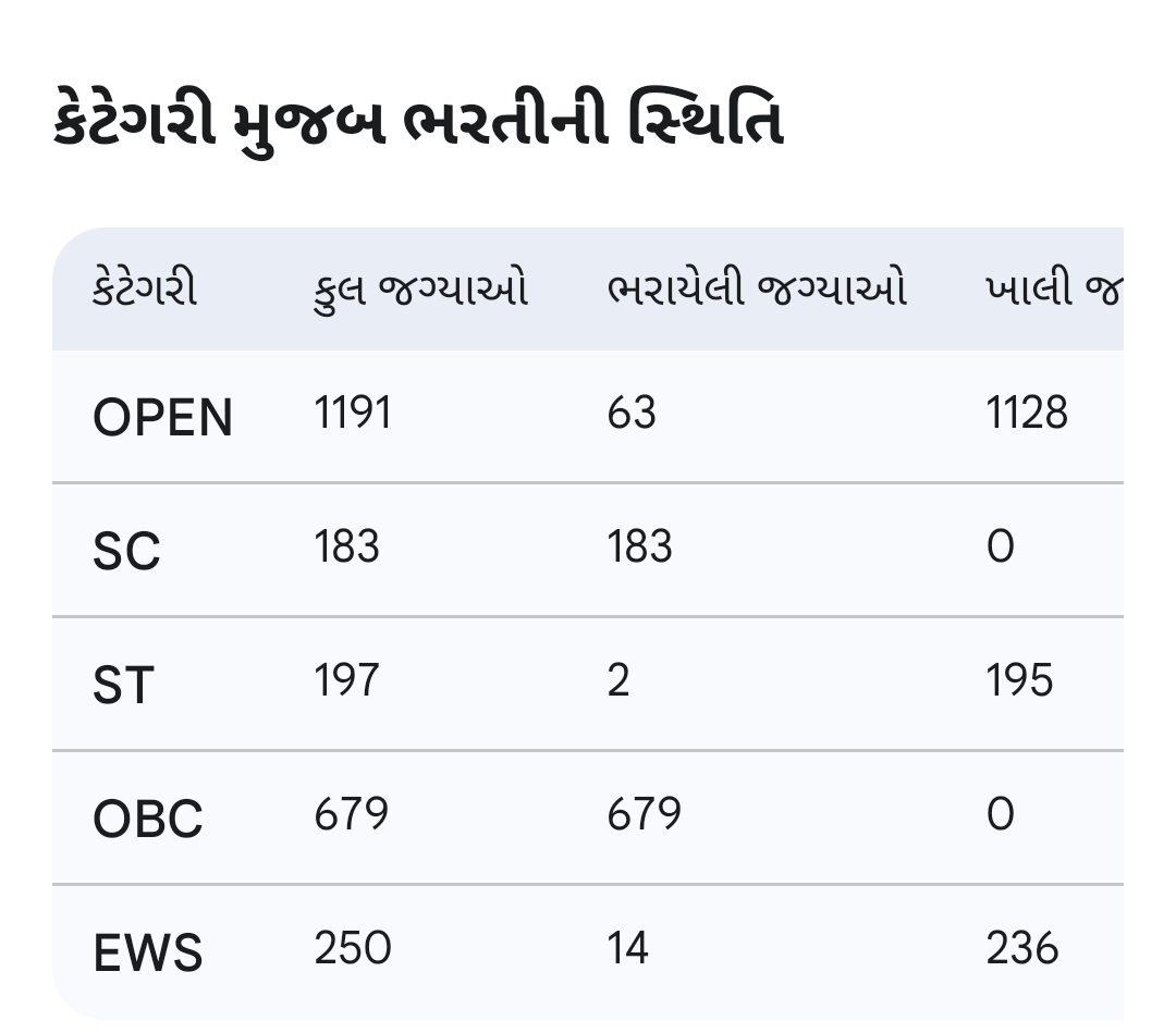 | કેટેગરી | કુલ જગ્યાઓ | ભરાયેલી જગ્યાઓ | ખાલી જગ્યાઓ |