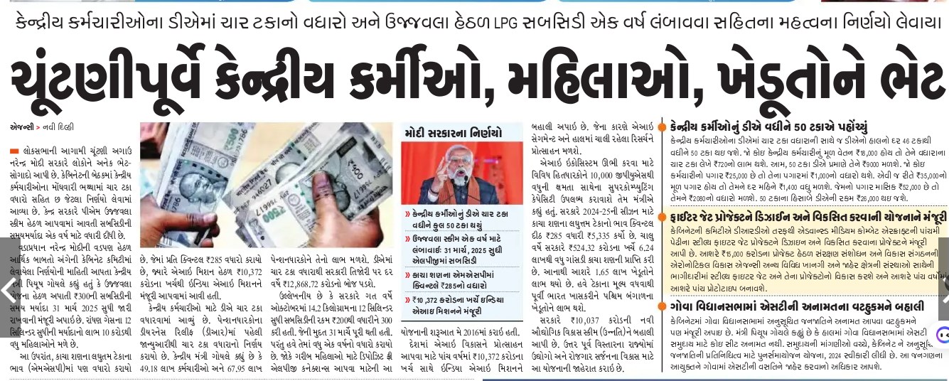 ચૂંટણીપૂર્વે કેન્દ્રીય કર્મીઓ, મહિલાઓ, ખેડૂતોને ભેટ લોકસભાની આગામી ચૂંટણી અગાઉ નરેન્દ્ર મોદી સરકારે લોકોને અનેક ભેટ- સોગાદો આપી છે. કેબિનેટની બેઠકમાં કેન્દ્રીય કર્મચારીઓના મોંઘવારી ભથ્થામાં ચાર ટકા વધારો સહિત છ જેટલા નિર્ણયો લેવામાં આવ્યા છે. કેન્દ્ર સરકારે પીએમ ઉજ્જવલા સ્કીમ હેઠળ આપવામાં આવતી સબસિડીની સમયમર્યાદા એક વર્ષ માટે વધારી દીધી છે.
