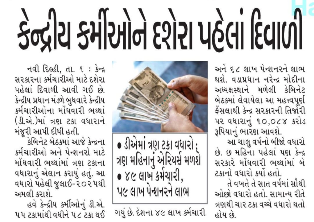 કેન્દ્રીય કર્મચારીઓ અને પેન્શનરો માટે ‘દશેરા પહેલાં દિવાળી’! મોંઘવારી ભથ્થામાં ૩% નો વધારો જાહેર