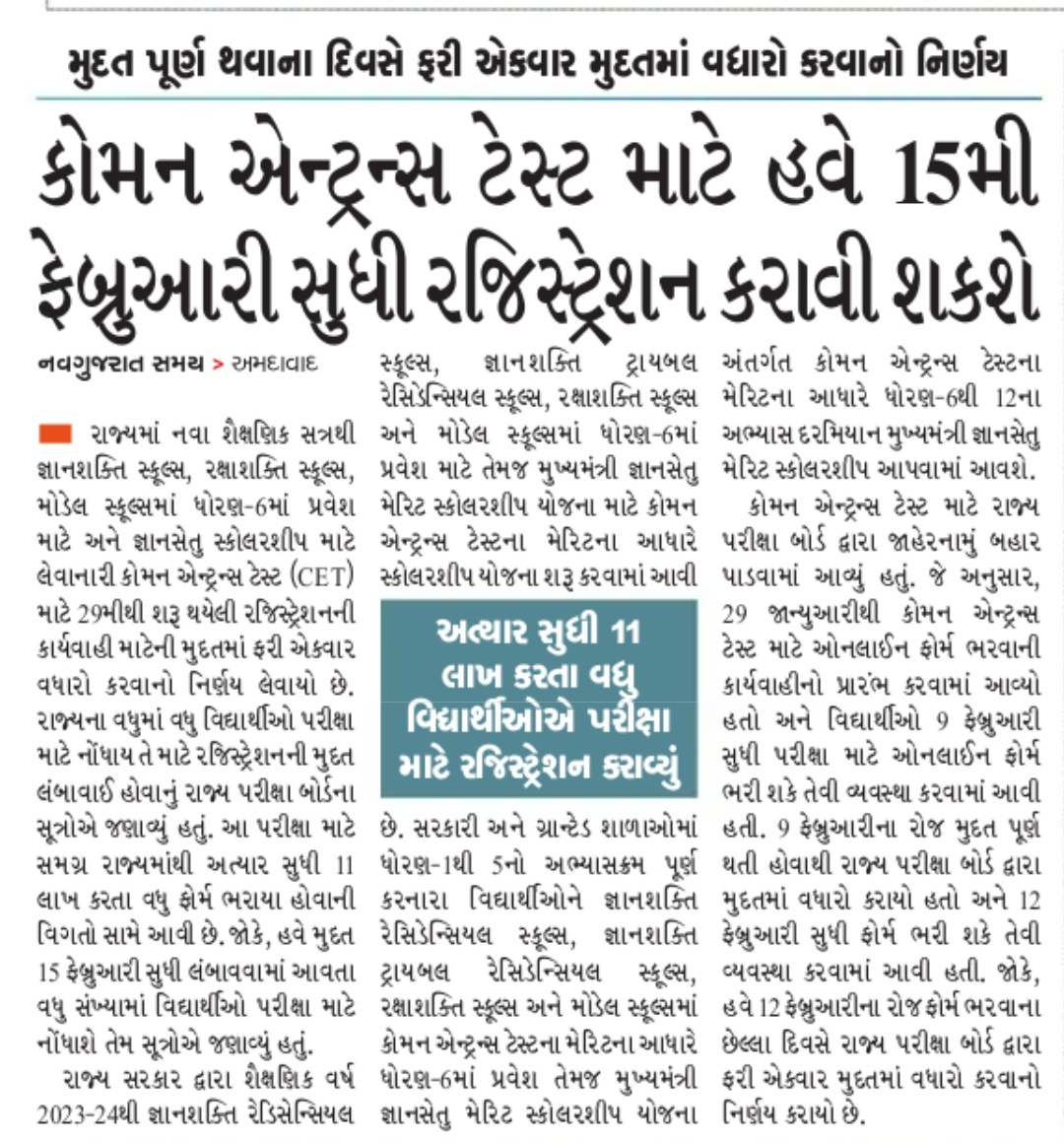 રાજ્યમાં નવા શૈક્ષણિક સત્રથી જ્ઞાનશક્તિ સ્કૂલ્સ, રક્ષાશક્તિ સ્કૂલ્સ, મોડેલ સ્કૂલ્સમાં ધોરણ-6માં પ્રવેશ માટે અને જ્ઞાનસેતુ સ્કોલરશીપ માટે લેવાનારી કોમન એન્ટ્રન્સ ટેસ્ટ (CET) માટે 29મીથી શરૂ થયેલી રજિસ્ટ્રેશનની કાર્યવાહી માટેની મુદતમાં ફરી એકવાર વધારો કરવાનો નિર્ણય લેવાયો છે. રાજ્યના વધુમાં વધુ વિદ્યાર્થીઓ પરીક્ષા માટે નોંધાય તે માટે રજિસ્ટ્રેશનની મુદ્દત લંબાવાઈ હોવાનું રાજ્ય પરીક્ષા બોર્ડના સૂત્રોએ જણાવ્યું હતું. આ પરીક્ષા માટે સમગ્ર રાજ્યમાંથી અત્યાર સુધી 11 લાખ કરતા વધુ ફોર્મ ભરાયા હોવાની વિગતો સામે આવી છે. જોકે, હવે મુદત 15 ફેબ્રુઆરી સુધી લંબાવવામાં આવતા વધુ સંખ્યામાં વિદ્યાર્થીઓ પરીક્ષા માટેનોંધાશે તેમ સૂત્રોએ જણાવ્યું હતું.
