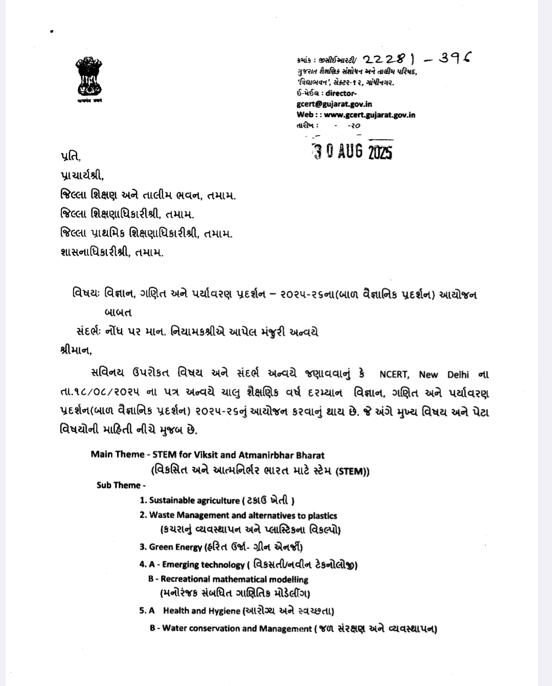 વિજ્ઞાન, ગણિત અને પર્યાવરણ પ્રદર્શન 2025-26 (બાળ વૈજ્ઞાનિક પ્રદર્શન) ની જાહેરાત