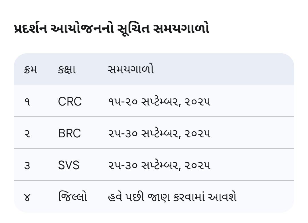 - ૧૦૦% ભાગીદારી: CRC અને SVS કક્ષાના પ્રદર્શનમાં ૧૦૦ ટકા શાળાઓ ભાગ લે તેવું આયોજન કરવા સૂચના અપાઈ છે.