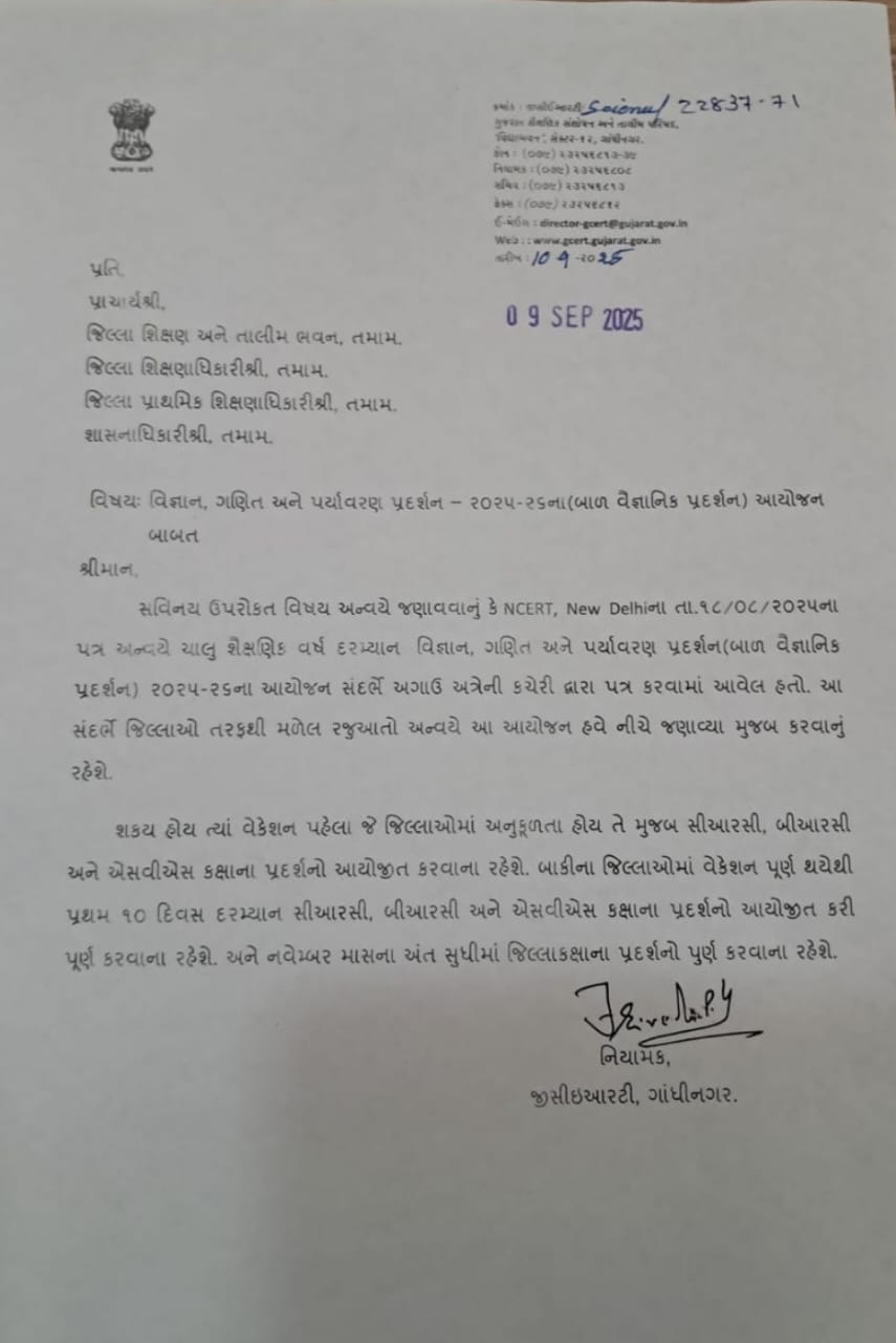 જીસીઈઆરટી, ગાંધીનગરના નિયામક દ્વારા તારીખ ૦૯/૦૯/૨૦૨૫ ના રોજ એક નવો પરિપત્ર બહાર પાડીને ચાલુ શૈક્ષણિક વર્ષ માટેના વિજ્ઞાન, ગણિત અને પર્યાવરણ પ્રદર્શન (બાળ વૈજ્ઞાનિક પ્રદર્શન) ના આયોજનની સમયરેખામાં ફેરફાર કરવામાં આવ્યો છે. જિલ્લાઓ તરફથી મળેલી રજૂઆતોને ધ્યાનમાં રાખીને આયોજનમાં વધુ સુગમતા આપવામાં આવી છે.