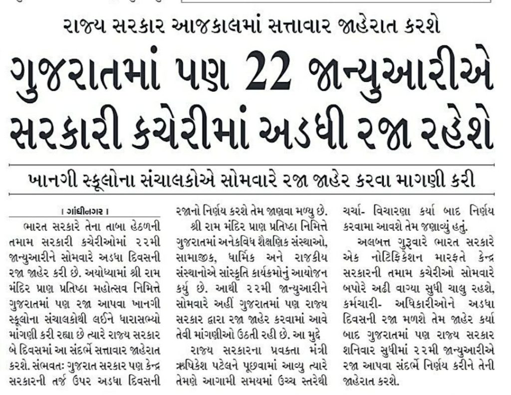 ભારત સરકારે તેના તાબા હેઠળની તમામ સરકારી કચેરીઓમાં ૨૨મી જાન્યુઆરીને સોમવારે અડધા દિવસની રજા જાહેર કરી છે. અયોધ્યામાં શ્રી રામ મંદિર પ્રાણ પ્રતિષ્ઠા મહોત્સવ નિમિત્તે ગુજરાતમાં પણ રજા આપવા ખાનગી સ્કૂલોના સંચાલકોથી લઈને ધારાસભ્યો માંગણી કરી રહ્યા છે ત્યારે રાજ્ય સરકાર બે દિવસમાં આ સંદર્ભે સત્તાવાર જાહેરાત કરશે. સંભવતઃ ગુજરાત સરકાર પણ કેન્દ્ર સરકારની તર્જ ઉપર અડધા દિવસની