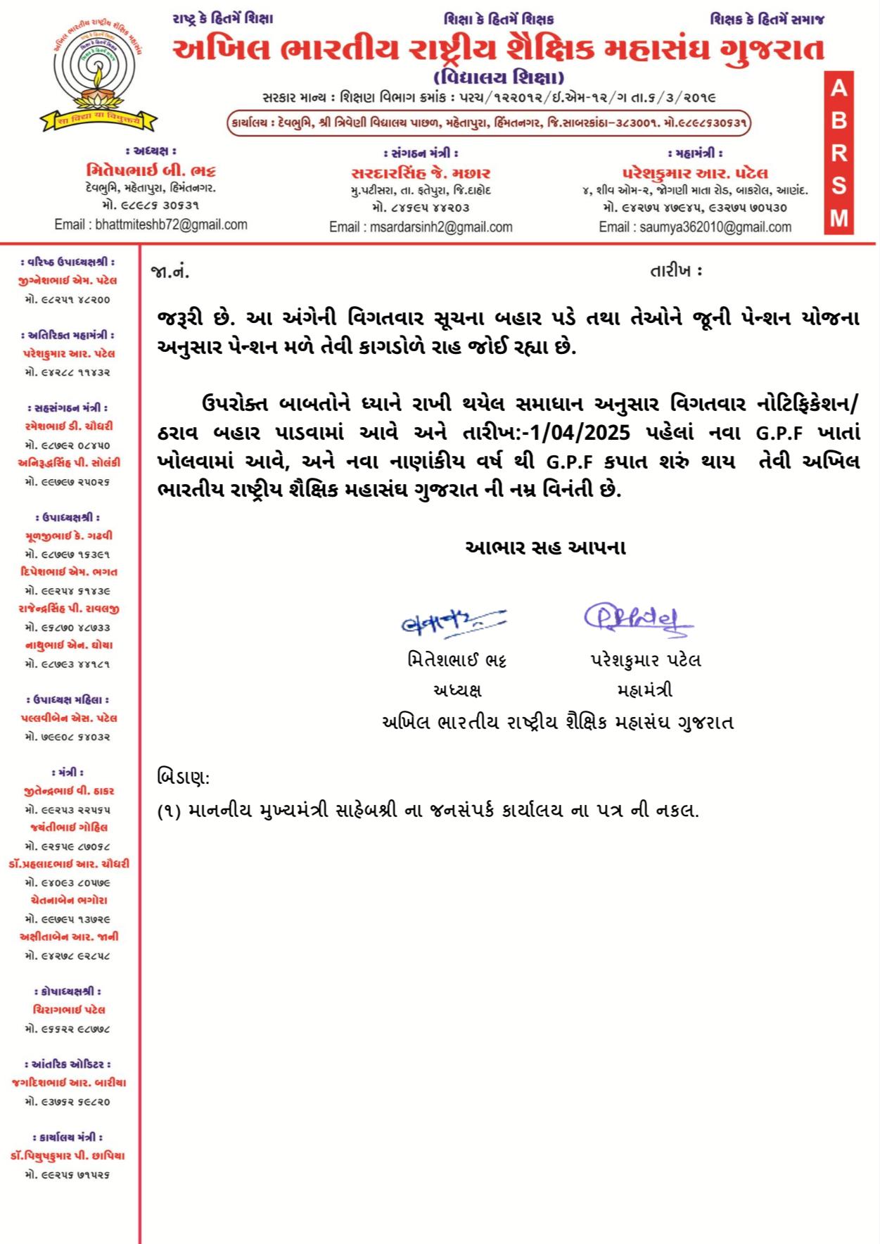 ઉપરોક્ત બાબતની રજૂઆત માનનીય મુખ્યમંત્રી સાહેબશ્રી ને કરવામાં આવી હતી જે સંદર્ભે ઉપરોક્ત સંદર્ભ પત્રમાં જણાવ્યા અનુસાર હવે આગળની કાર્યવાહી કરવા માટે આપ સાહેબ શ્રી ની કચેરીનો સંપર્ક અને પત્ર વ્યવહાર કરવા જણાવેલ છે જેને ધ્યાને લઈ વધુમાં એક નમ્ર વિનંતી છે કે વર્તમાનમાં 01/04/2005 પહેલા નિમાયેલ અને વર્તમાનમાં નિવૃત્ત થઈ ગયા છે, ઘણા શિક્ષકો તથા કર્મચારીઓ આગળ ના સત્રમાં તારીખ:-31/05/2025 ના રોજ નિવૃત્ત થવાના છે.