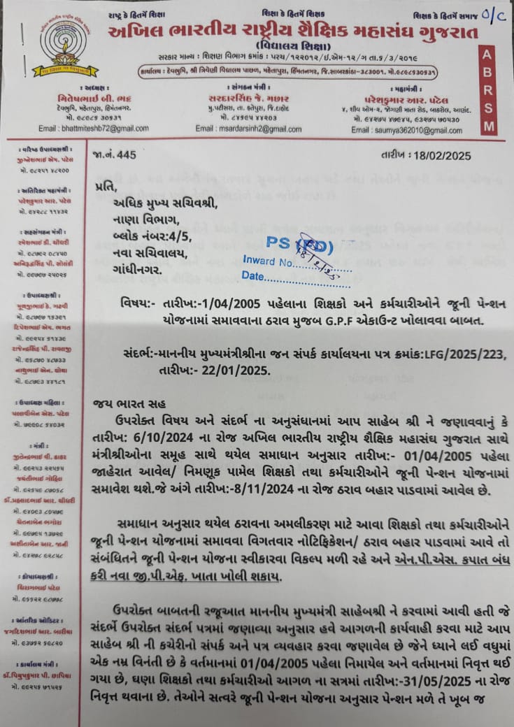 ઉપરોક્ત વિષય અને સંદર્ભ ના અનુસંધાનમાં આપ સાહેબ શ્રી ને જણાવવાનું કે તારીખ: 6/10/2024 ના રોજ અખિલ ભારતીય રાષ્ટ્રીય શૈક્ષિક મહાસંઘ ગુજરાત સાથે મંત્રીશ્રીઓના સમૂહ સાથે થયેલ સમાધાન અનુસાર તારીખ:- 01/04/2005 પહેલા જાહેરાત આવેલ/ નિમણૂક પામેલ શિક્ષકો તથા કર્મચારીઓને જૂની પેન્શન યોજનામાં સમાવેશ થશે.જે અંગે તારીખ:-8/11/2024 ના રોજ ઠરાવ બહાર પાડવામાં આવેલ છે.