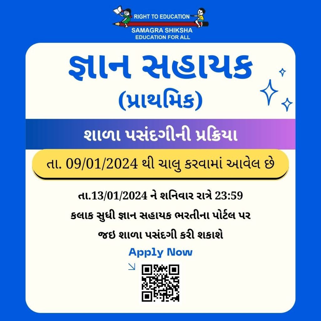 જ્ઞાન સહાયક (પ્રાથમિક) માટે શાળા પસંદગીની પ્રક્રિયા (Choice Filling) તા.09/01/2024 ને મંગળવારથી શરુ કરવામાં આવે છે. જે તા.13/01/2024 ને શનિવાર રાત્રે 23:59 કલાક સુધી જ્ઞાન સહાયક (પ્રાથમિક) ભરતીના પોર્ટલ પર જઇ કરી શકાશે.