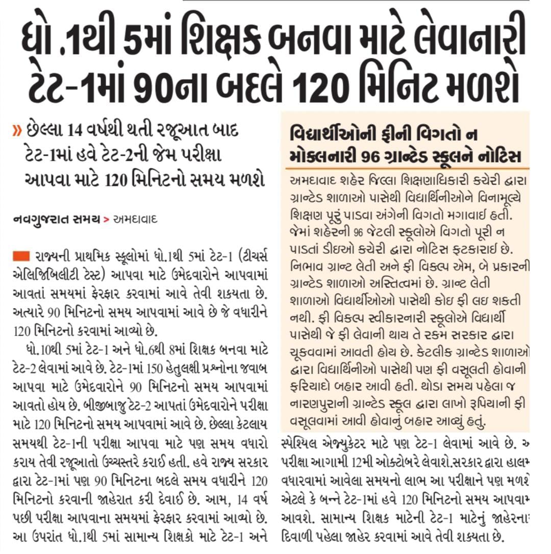 ધો. ૬ થી ૮ માં શિક્ષક બનવા માટે લેવાતી TET-2 ની પરીક્ષામાં પણ હવે TET-1ની જેમ ૧૨૦ મિનિટનો સમય આપવાની રજૂઆત સ્વીકારવામાં આવી છે, જે અંગેની સત્તાવાર જાહેરાત ટૂંક સમયમાં થઈ શકે છે.