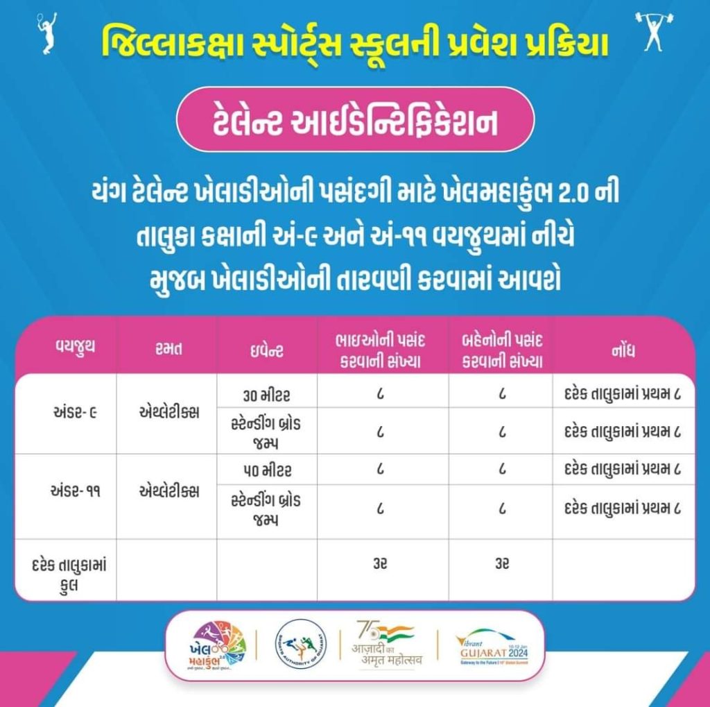 ગુજરાતની જિલ્લાકક્ષા સ્પોર્ટ્સ સ્કૂલ યોજના DLSS અંતર્ગત ટેલેન્ટ આઈડેન્ટિફિકેશન પ્રવેશ પ્રક્રિયા માટે ખેલમહાકુંભ 2.0માં યોજાનાર તાલુકા કક્ષાની અં-૯ અને અં-૧૧ વયજુથની સ્પર્ધાના વિજેતા ખેલાડીઓમાંથી પસંદગી કરવામાં આવશે.