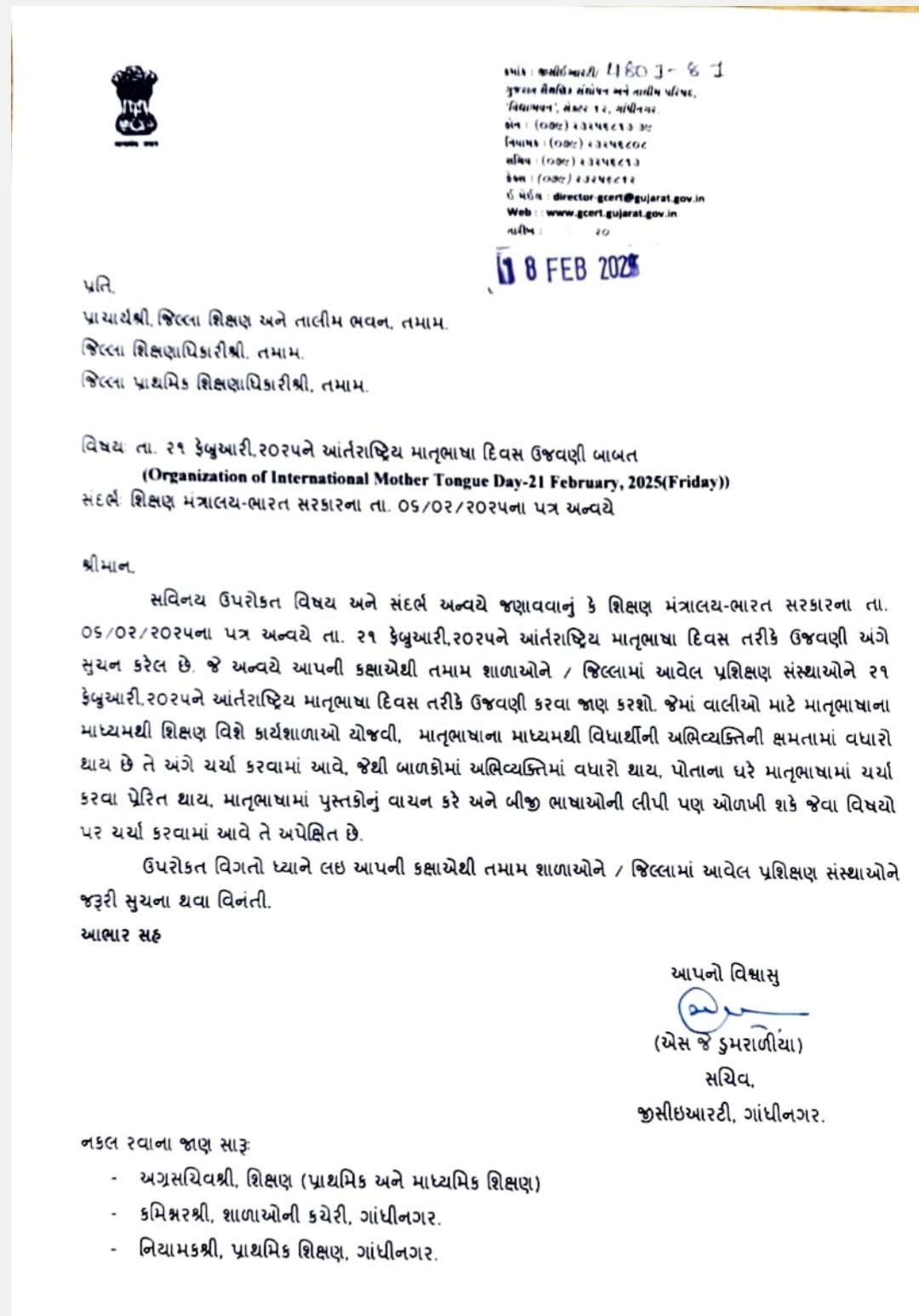 સવિનય ઉપરોકત વિષય અને સંદર્ભ અન્વયે જણાવવાનું કે શિક્ષણ મંત્રાલય-ભારત સરકારના તા. ૦૬/૦૨/૨૦૨૫ના પત્ર અન્વયે તા. ૨૧ ફેબ્રુઆરી, ૨૦૨૫ને આંર્તરાષ્ટ્રિય માતૃભાષા દિવસ તરીકે ઉજવણી અંગે સુચન કરેલ છે. જે અન્વયે આપની કક્ષાએથી તમામ શાળાઓને / જિલ્લામાં આવેલ પ્રશિક્ષણ સંસ્થાઓને ૨૧ ફેબ્રુઆરી,૨૦૨૫ને આર્તરાષ્ટ્રિય માતૃભાષા દિવસ તરીકે ઉજવણી કરવા જાણ કરશો.