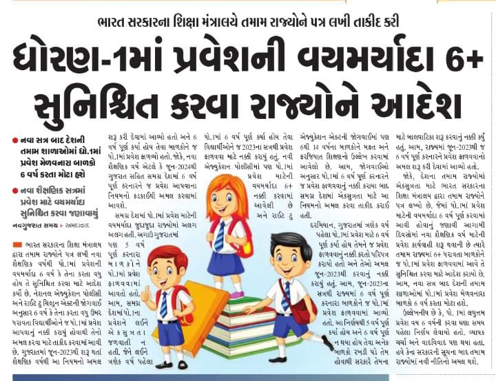 ધોરણ એકમાં પ્રવેશની વયમર્યાદા બાબતે અગત્યના સમાચાર Admin February 27, 2024 Uncategorized Comments ધોરણ