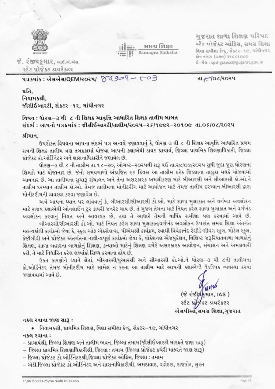 ધોરણ ૩ થી ૮ ની તાલીમમાં crc-brc ને તાલીમના કો ઓર્ડીનેટર તરીકે અને મોનીટરીંગ મા સામેલ ન કરવા અંગે Admin August 8, 2025 Uncategorized Comments