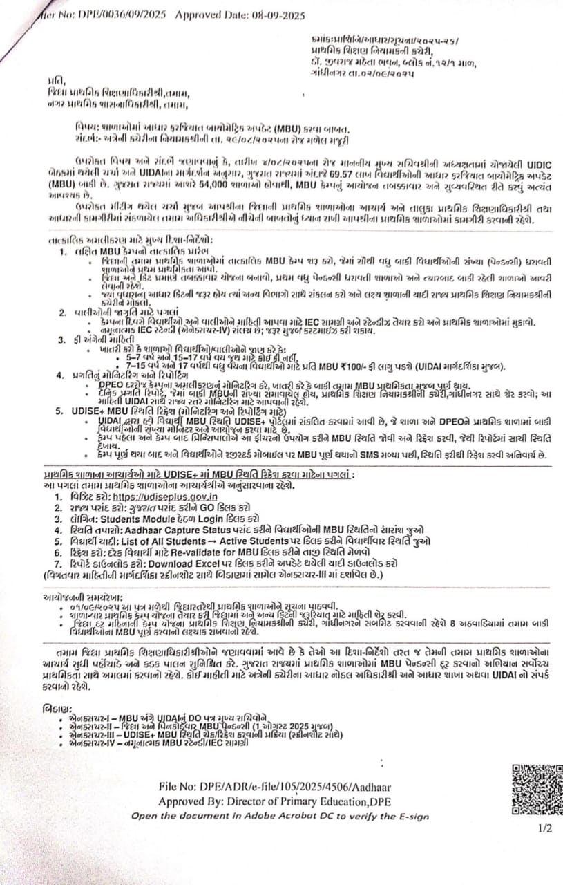 ​પ્રાથમિક શિક્ષણ નિયામકની કચેરી, ગુજરાત રાજ્ય દ્વારા તાજેતરમાં એક મહત્વપૂર્ણ પરિપત્ર જાહેર કરવામાં આવ્યો છે, જે રાજ્યની તમામ પ્રાથમિક શાળાઓના આચાર્યો અને શિક્ષકો માટે ખાસ અગત્યનો છે. આ પરિપત્ર વિદ્યાર્થીઓના આધાર કાર્ડ અને બાયોમેટ્રિક વિગતોને અપડેટ કરવા માટે તાલુકા કક્ષાએ આયોજિત “મોબાઈલ બાયોમેટ્રિક યુનિટ” (MBU) કેમ્પ સંબંધિત છે.