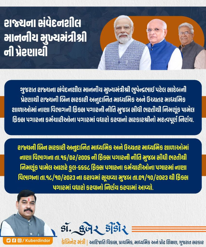 ગુજરાત રાજ્યના સંવેદનશીલ માનનીય મુખ્યમંત્રીશ્રી ભુપેન્દ્રભાઈ પટેલ સાહેબની પ્રેરણાથી રાજ્યની બિન સરકારી અનુદાનિત માધ્યમિક અને ઉચ્ચતર માધ્યમિક શાળાઓમાં નાણા વિભાગની ફિક્સ પગારની નીતિ મુજબ સીધી ભરતીથી નિમણૂંક પામેલ ફિક્સ પગારના કર્મચારીઓના પગારમાં વધારો કરવાનો સરકારશ્રીનો મહત્વપૂર્ણ નિર્ણય.