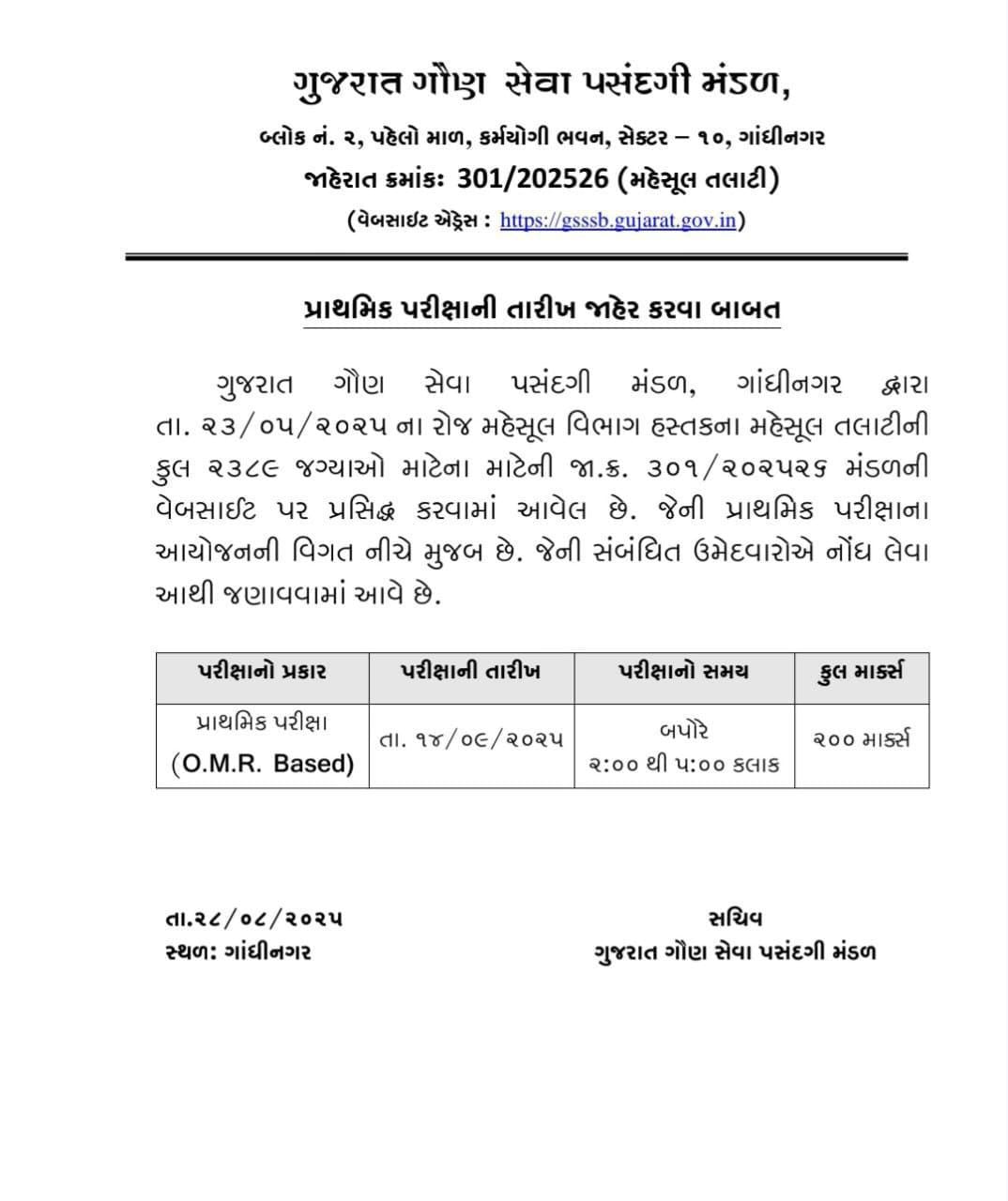 ગુજરાત ગૌણ સેવા પસંદગી મંડળ (GSSSB) દ્વારા મહેસૂલ વિભાગ હસ્તકની તલાટીની કુલ 2389 જગ્યાઓ માટેની ભરતી (જાહેરાત ક્રમાંક: 301/202526) માટે પ્રાથમિક પરીક્ષાની તારીખ જાહેર કરવામાં આવી છે. સંબંધિત ઉમેદવારોએ જેની નોંધ લેવી.