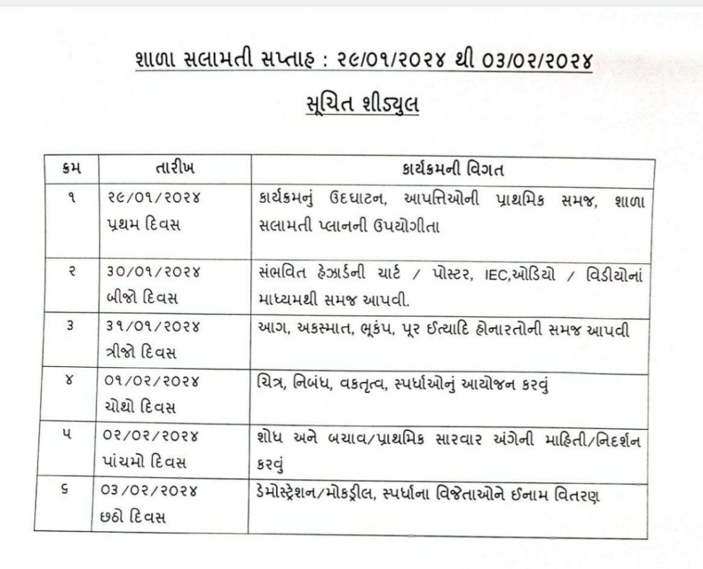 શાળા સલામતી સપ્તાહ ઉજવણી ડે ટુ ડે કાર્યક્રમ રૂપરેખા શાળા કક્ષાએ કરવાની પ્રવૃત્તિ આયોજન સપ્તાહ ઊજવણી 29/01/2024 થી 03/02/2024 દરમિયાન કરવાની રહેશે