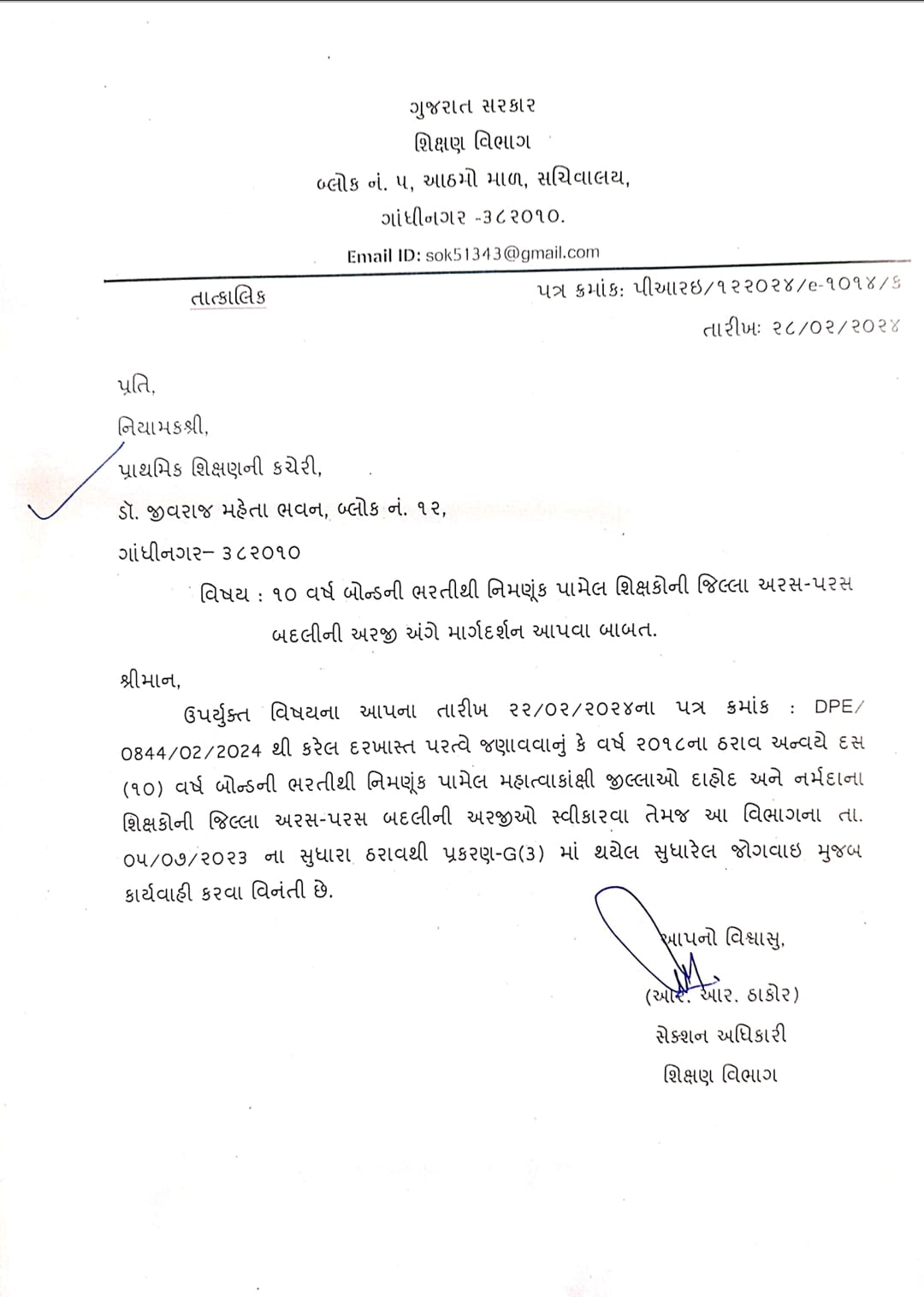 ૧૦ વર્ષ બોન્ડની ભરતીથી નિમણૂંક પામેલ શિક્ષકોની જિલ્લા અરસ-પરસ બદલીની અરજી અંગે માર્ગદર્શન આપવા બાબત. Admin February 28, 2024 Uncategorized Comments ૧૦ વર્ષ બોન્ડની ભરતીથી નિમણૂંક પામેલ શિક્ષકોની જિલ્લા અરસ-પરસ બદલીની અરજી અંગે માર્ગદર્શન આપવા બાબત.