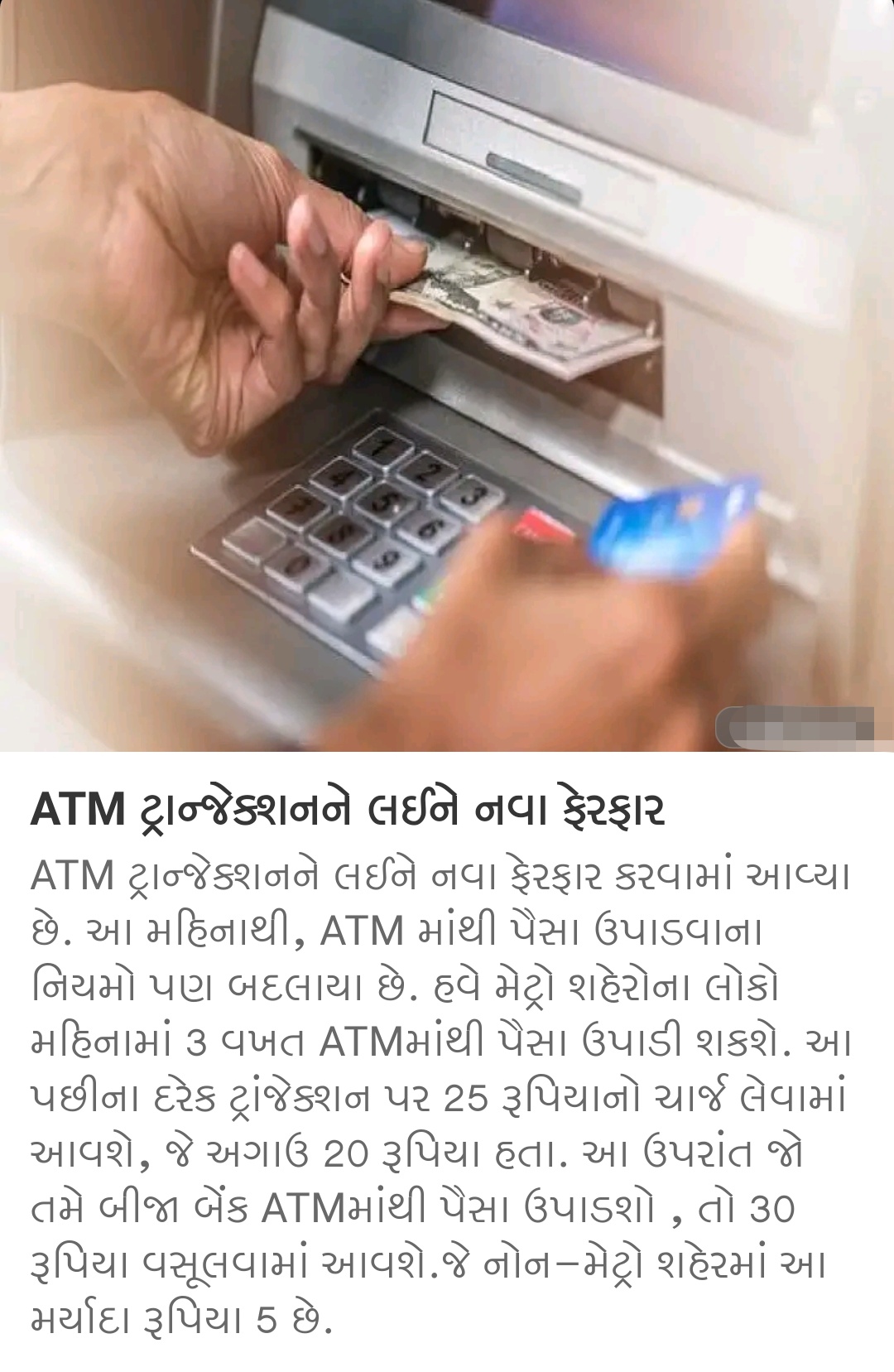 ATM ટ્રાન્જેક્શનને લઈને નવા ફેરફાર કરવામાં આવ્યા છે. આ મહિનાથી, ATM માંથી પૈસા ઉપાડવાના નિયમો પણ બદલાયા છે. હવે મેટ્રો શહેરોના લોકો મહિનામાં 3 વખત ATMમાંથી પૈસા ઉપાડી શકશે. આ પછીના દરેક ટ્રાંજેક્શન પર 25 રૂપિયાનો ચાર્જ લેવામાં આવશે, જે અગાઉ 20 રૂપિયા હતા. આ ઉપરાંત જો તમે બીજા બેંક ATMમાંથી પૈસા ઉપાડશો, તો 30 રૂપિયા વસૂલવામાં આવશે.જે નોન-મેટ્રો શહેરમાં આ મર્યાદા રૂપિયા 5 છે.