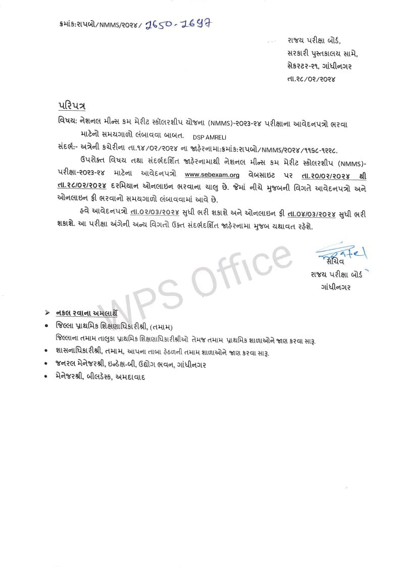 Nmms ફોર્મ ભરવાની તારીખ લંબાઈ છે Admin February 28, 2024 Uncategorized Comments Nmms ફોર્મ ભરવાની તારીખ લંબાઈ છે તારીખ ૦૨/૦૩/૨૦૨૪ સુધી ફોર્મ ભરી શકાશે જ્યારે ઓનલાઈન ફીસ ૦૪/૦૩/૨૦૨૪ સુધી માં ભરી શકશે
