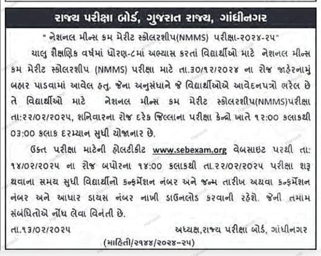ચાલુ શૈક્ષણિક વર્ષમાં ધોરણ-૮માં અભ્યાસ કરતાં વિદ્યાર્થીઓ માટે નેશનલ મીન્સ sinh ક્રમ મેરીટ સ્કોલરશીપ (NMMS) પરીક્ષા માટે તા.૩૦/૧૨/૨૦૨૪ ના રોજ જાહેરનામું બહાર પાડવામાં આવેલ હતુ. જેના અનુસંધાને જે વિદ્યાર્થીઓએ આવેદનપત્રો ભરેલ છે તે વિદ્યાર્થીઓ માટે નેશનલ મીન્સ કમ મેરીટ સ્કોલરશીપ(NMMS)પરીક્ષા તા:૨૨/૦૨/૨૦૨૫, શનિવારના રોજ દરેક જિલ્લાના પરીક્ષા કેન્દ્રો ખાતે ૧૨:૦૦ કલાકથી ૦૩:૦૦ કલાક દરમ્યાન સુધી યોજાનાર છે.